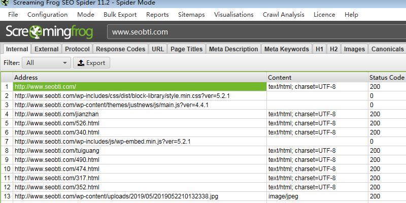 尖叫青蛙强大的地方就在于它不仅获取了网站内所有的链接,我们通过链接的就能获取到该链接的所有信息,大致包括该链接包含链接数、状态码、是否被robots屏蔽、该网页标题、标题长度、描述、关键词、发布时间等等所有的信息,分析的信息详细到只有你想不到的,没有你找不到的。